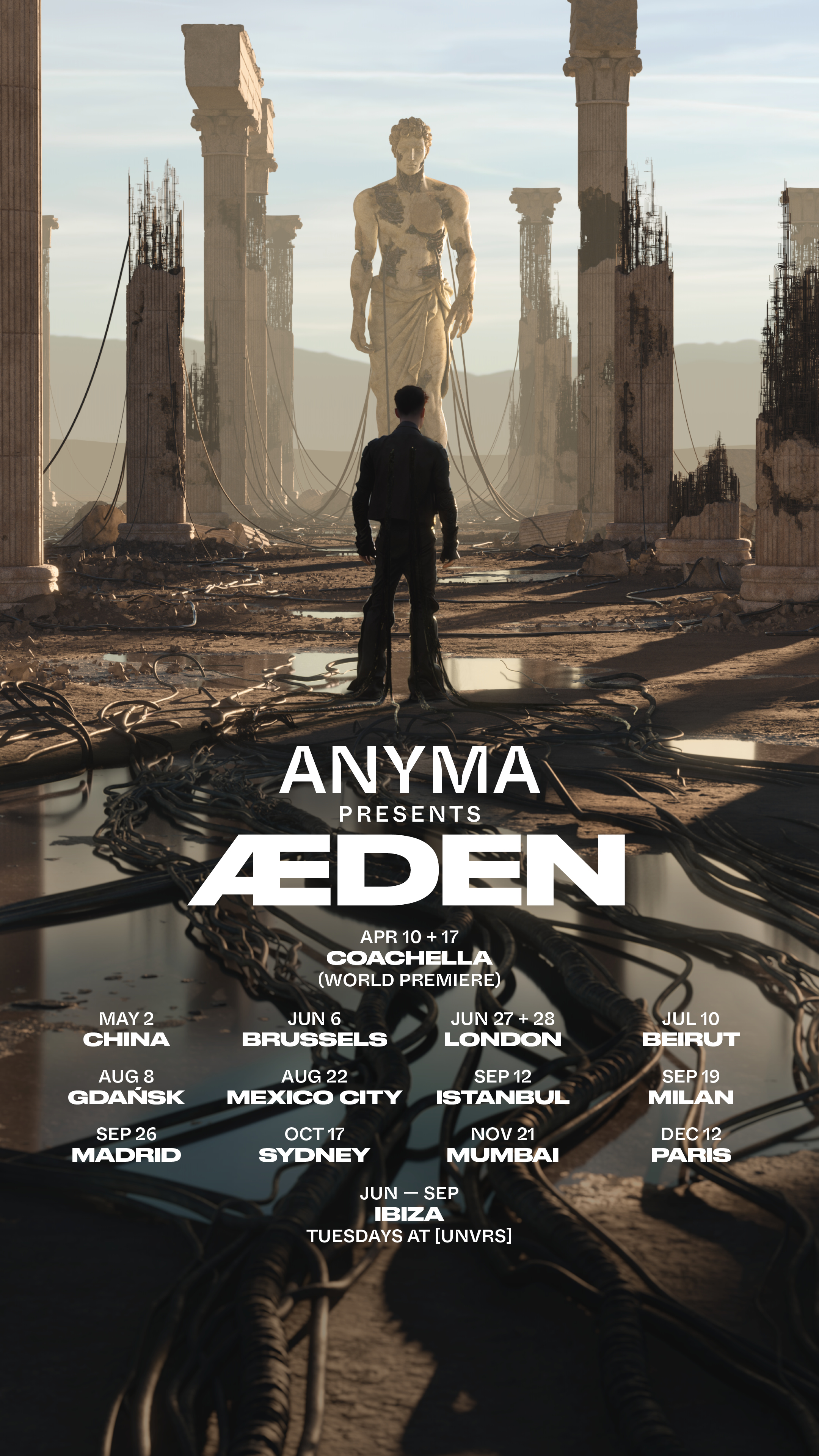 DJ, producent i twórca multidyscyplinarny Anyma ogłosił trasę koncertową ÆDEN World Tour 2026. Po premierowych występach na festiwalu Coachella 10 i 17 kwietnia Anyma ruszy do 12 krajów Azji, Bliskiego Wschodu, Australii i Europy. Polski przystanek to industrialna przestrzeń Stoczni Gdańskiej - tam Anyma zagra 8 sierpnia. Bilety na koncerty plenerowe i halowe trafią do przedsprzedaży 18 lutego, a sprzedaż ogólna ruszy 19 lutego - zapisy są możliwe pod tym linkiem. W tym roku Anyma wróci również na Ibizę i zatrzyma się na dłużej w największym klubie świata, [UNVRS]. Jego koncerty będą się odbywać we wtorki od czerwca do września 2026 roku. Daty kolejnych występów zostaną ogłoszone w nadchodzących tygodniach.